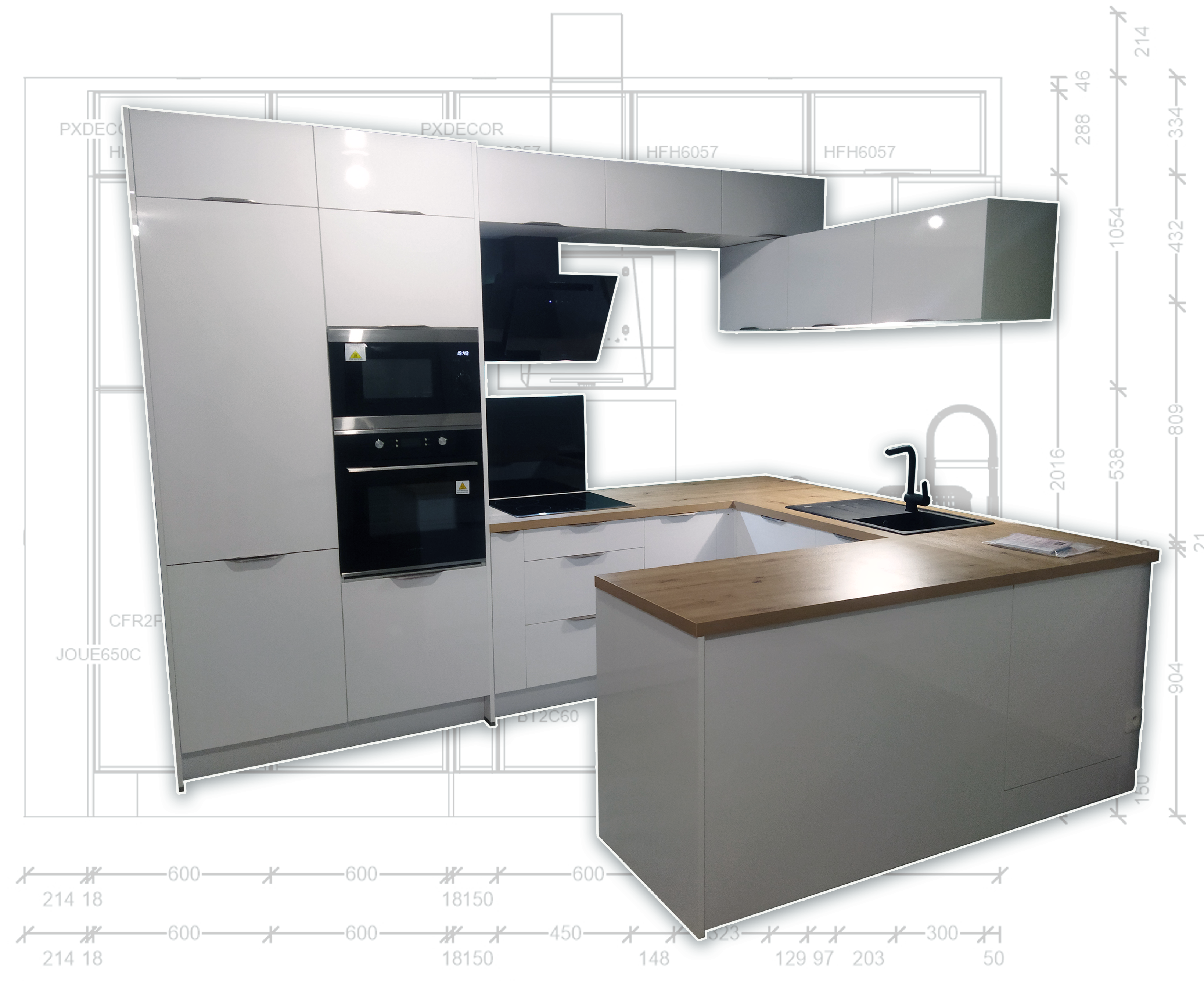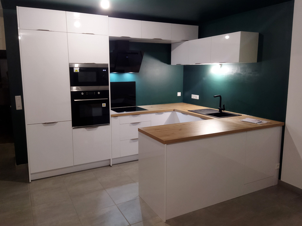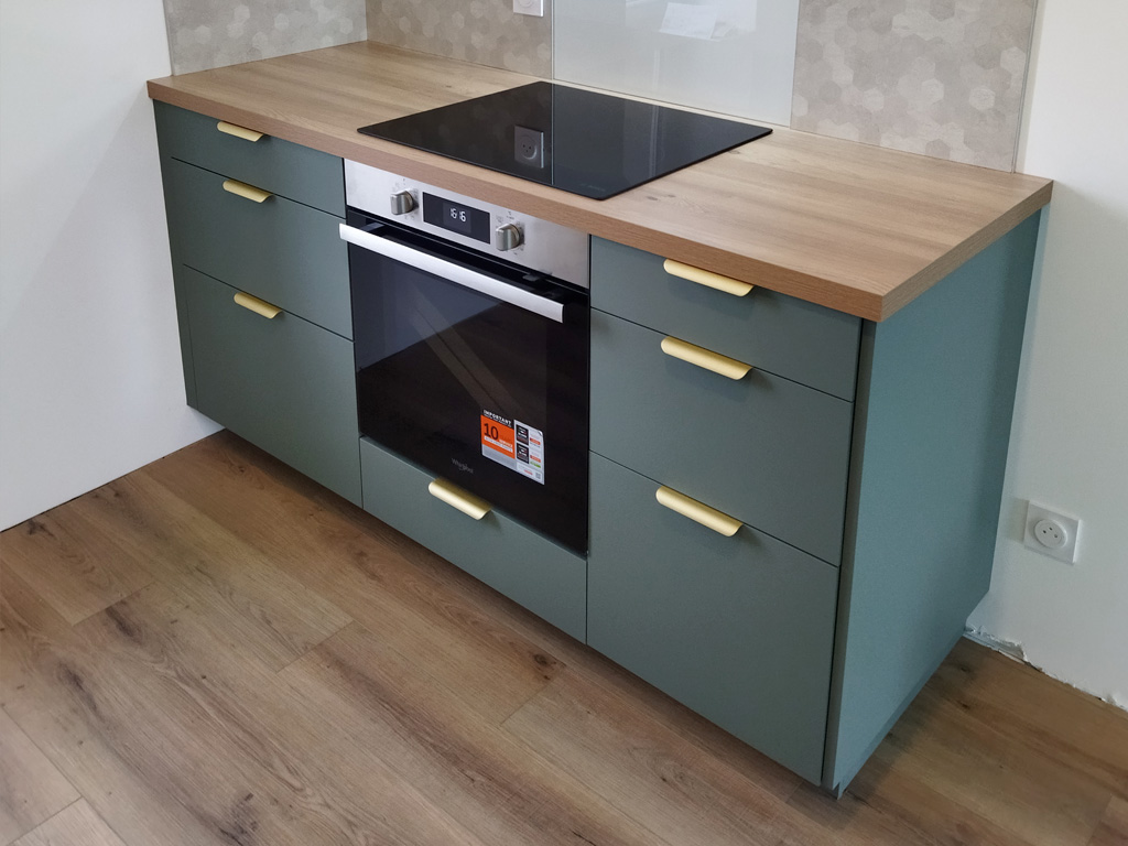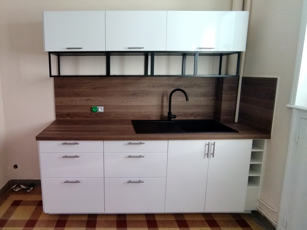Montage et installation complète de votre cuisine : montage/pose des caissons, découpe du plan de travail, branchement de l'électroménager, raccordement de la plomberie.